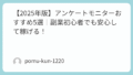 アンケートモニターは、副業初心者でも安心して始められる第一歩。 ぽむくんテンプレートで記録しながら、コツコツ続ければ副収入にもつながります。