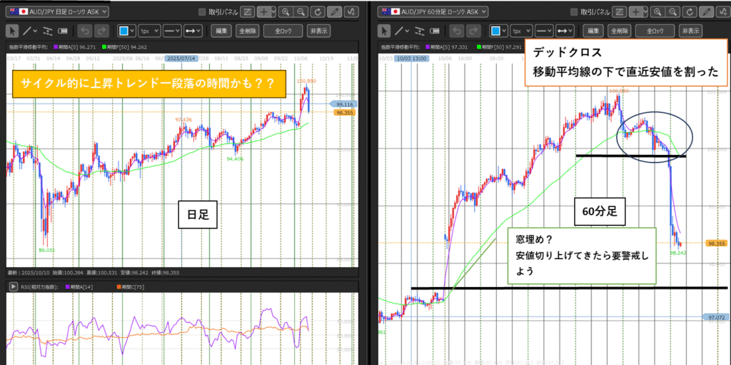 今回は、豪ドル円(AUD/JPY)の“日足と60分足”を並べて見ながら、トレンドの強さや転換の可能性を探っていくよ!