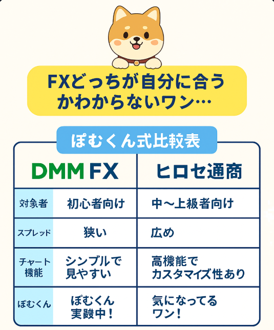【FX口座比較】ヒロセ通商 vs DMM FX|ぽむくん式チャート分析で選ぶワン🐾